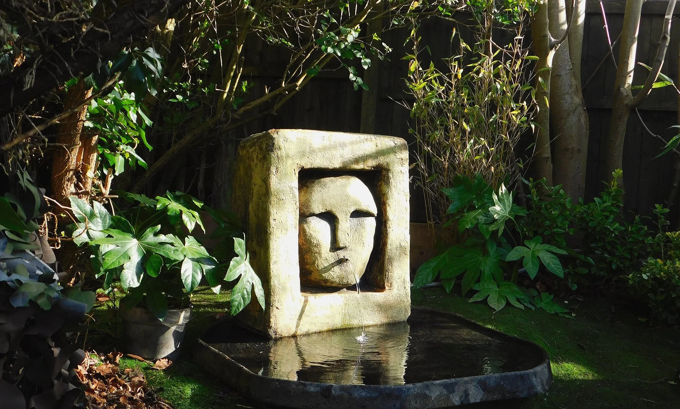 This sculpture acts as a water feature, with a copper spout mouthpiece it “spits” out water.
