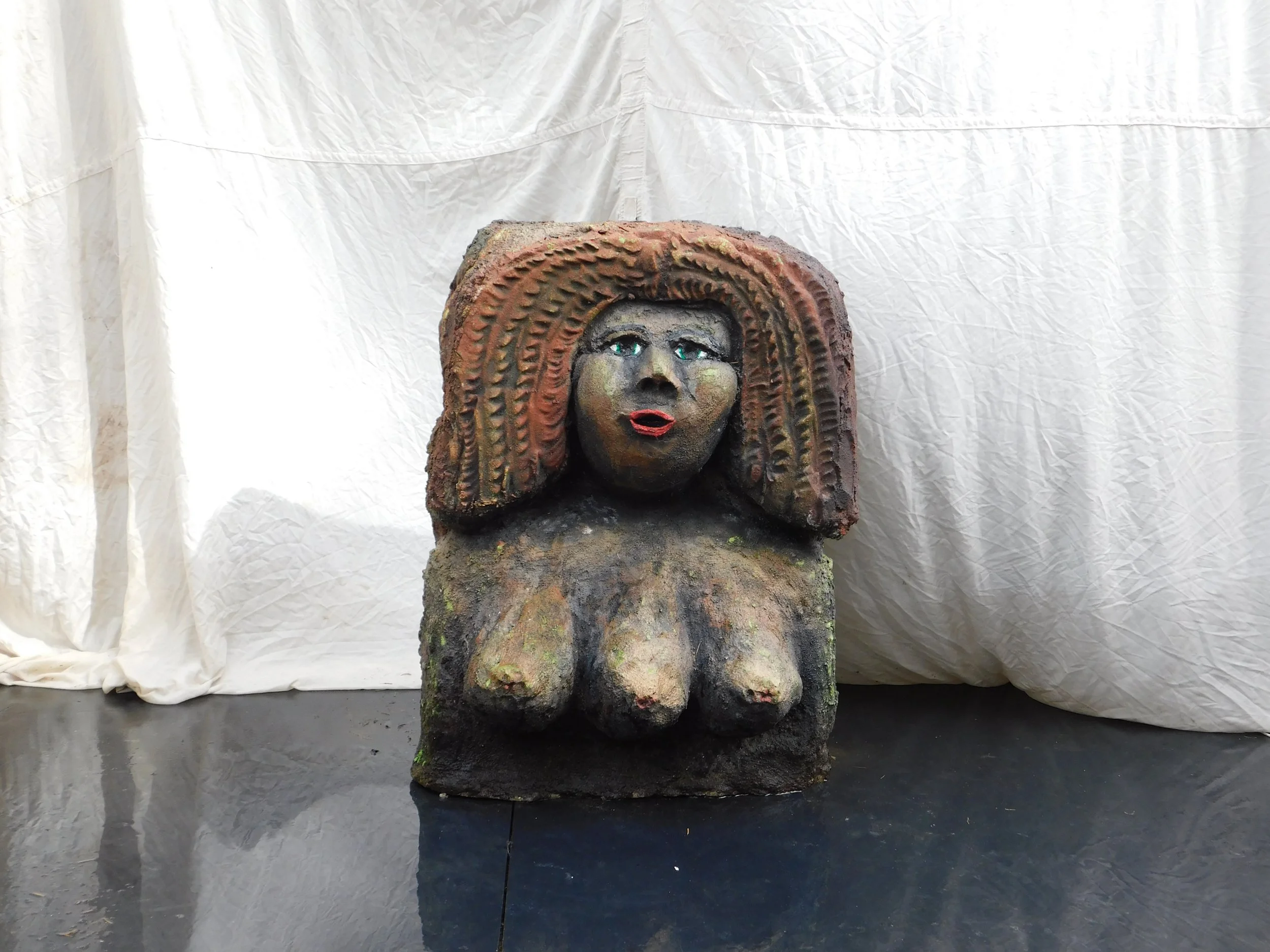 A face framed by red blocky braided hair and her most distinguishing ‘feature’ being her 3 bosoms.